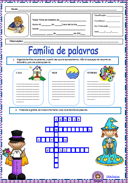 Ficha de trabalho para alunos do 5º ano sobre família de palavras. Download: https://app.box.com/s/a26be0no84ajvuc2wevw8vgvoee1e59o